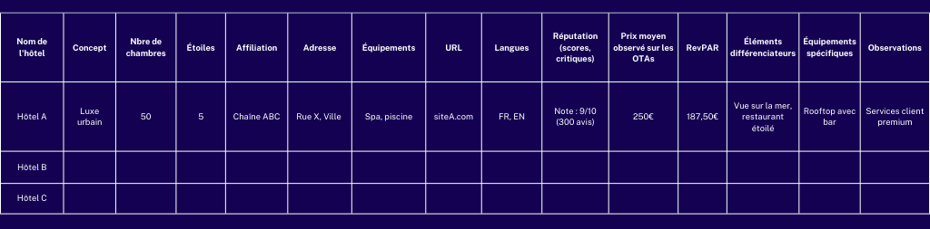 Vous trouverez des informations relatives au revenue management sur le site STR. Pour connaître le prix moyen pratiqué par vos concurrents, vous devrez analyser les tarifs qui apparaissent sur booking.com ainsi que leur site web. Les avis clients, éléments différenciateurs, équipements et positionnement peuvent être trouvés sur Google Hotel Finder, TripAdvisor et Google Business.